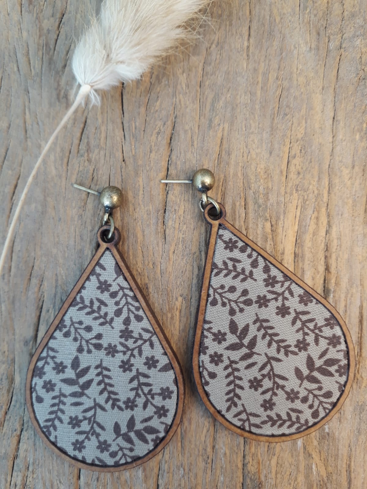 Brinco feito de madeira MDF e tecido. Altura total 7cm. Pino ouro velho.