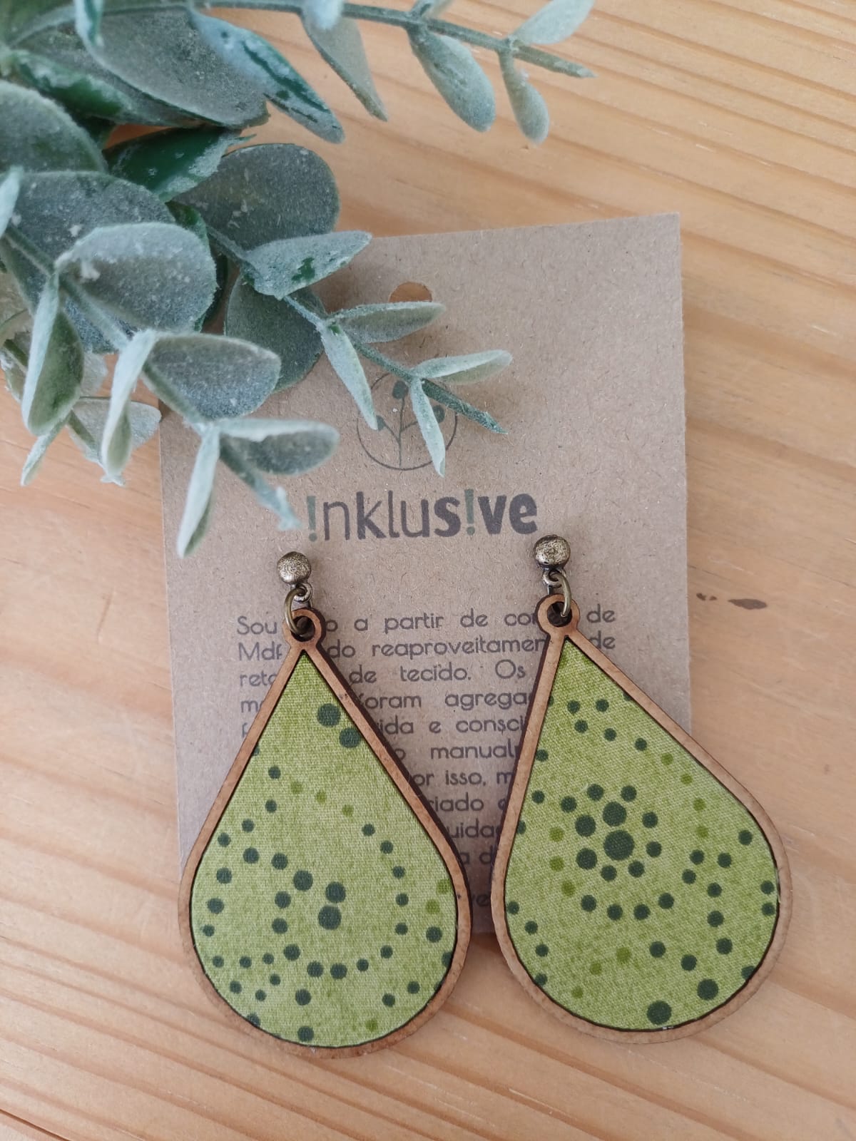Brinco feito de MDF e tecido. 7cm. Pino ouro velho.