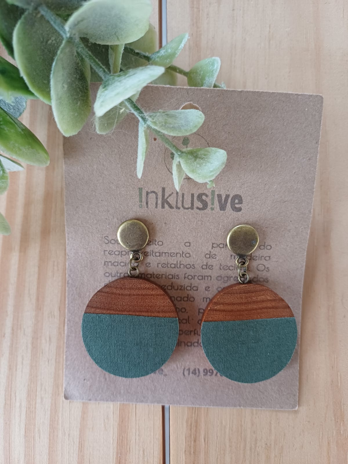 Brinco feito de cabreúva ( madeira nobre de reaproveitamento) e tecido. Pingente: 3cm. Altura total: Ler mais