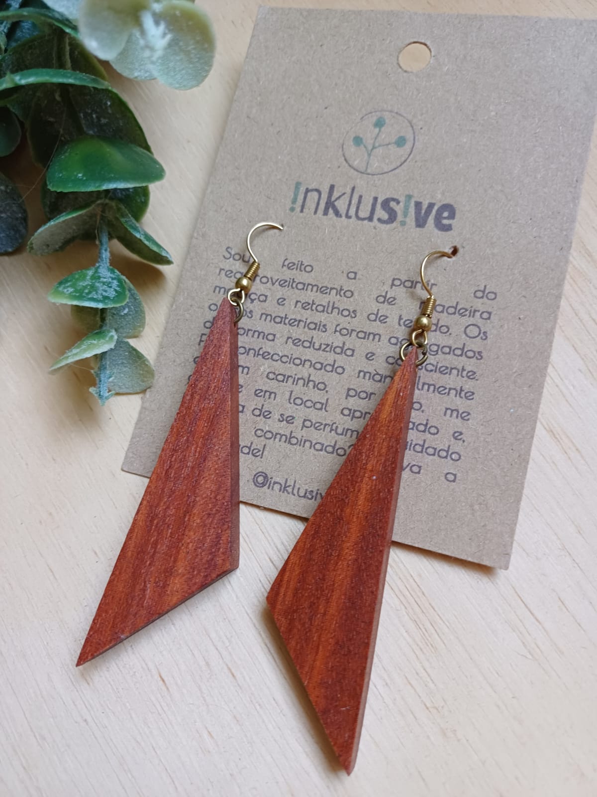 Brinco em madeira maciça de reaproveitamento. Medida 7cm de comprimento . Pino em metal ouro velho.