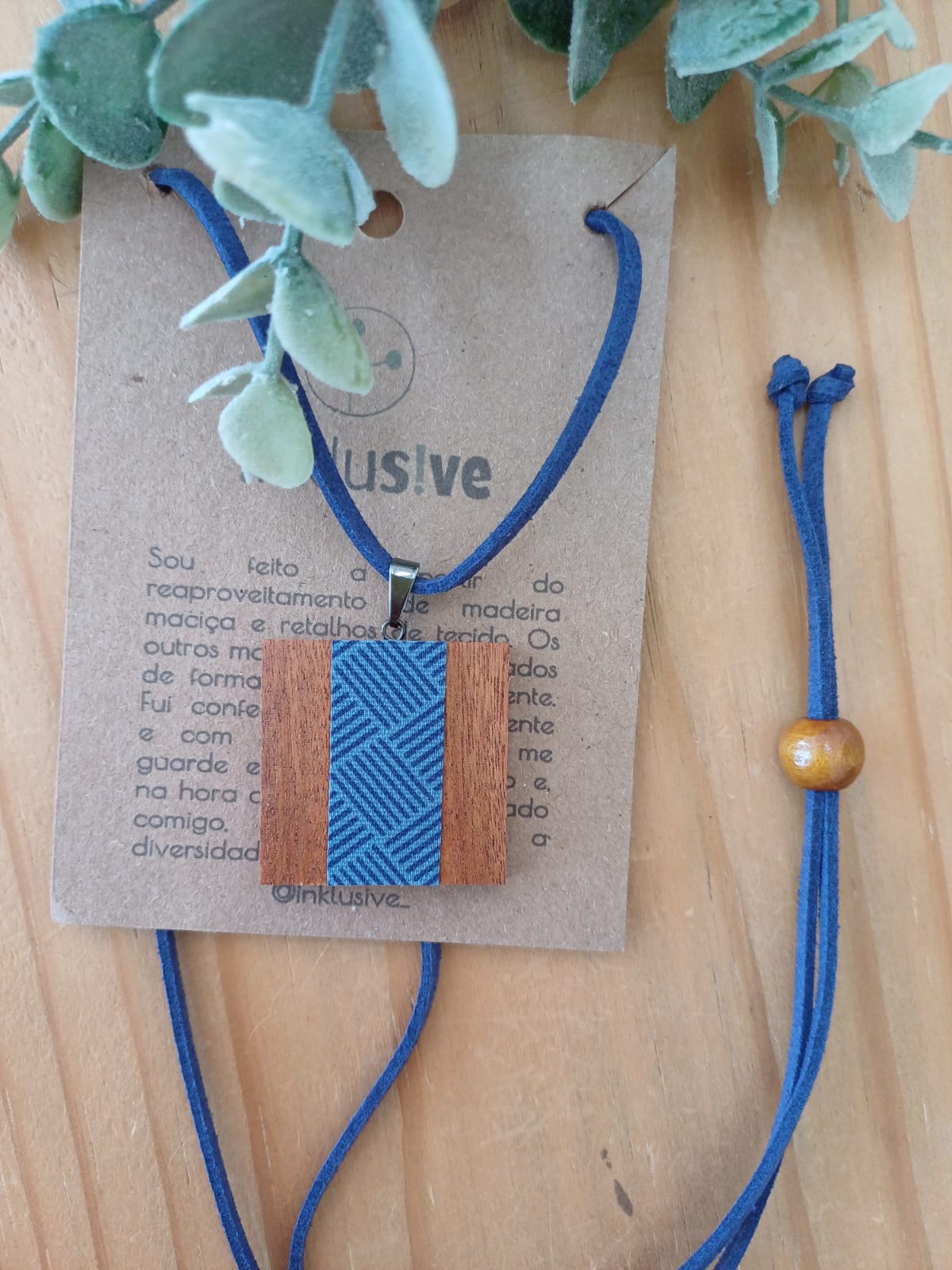 Colar feito de cabreúva (madeira nobre de reaproveitamento) e tecido. Pingente 3cm. Cordão em camurç Ler mais