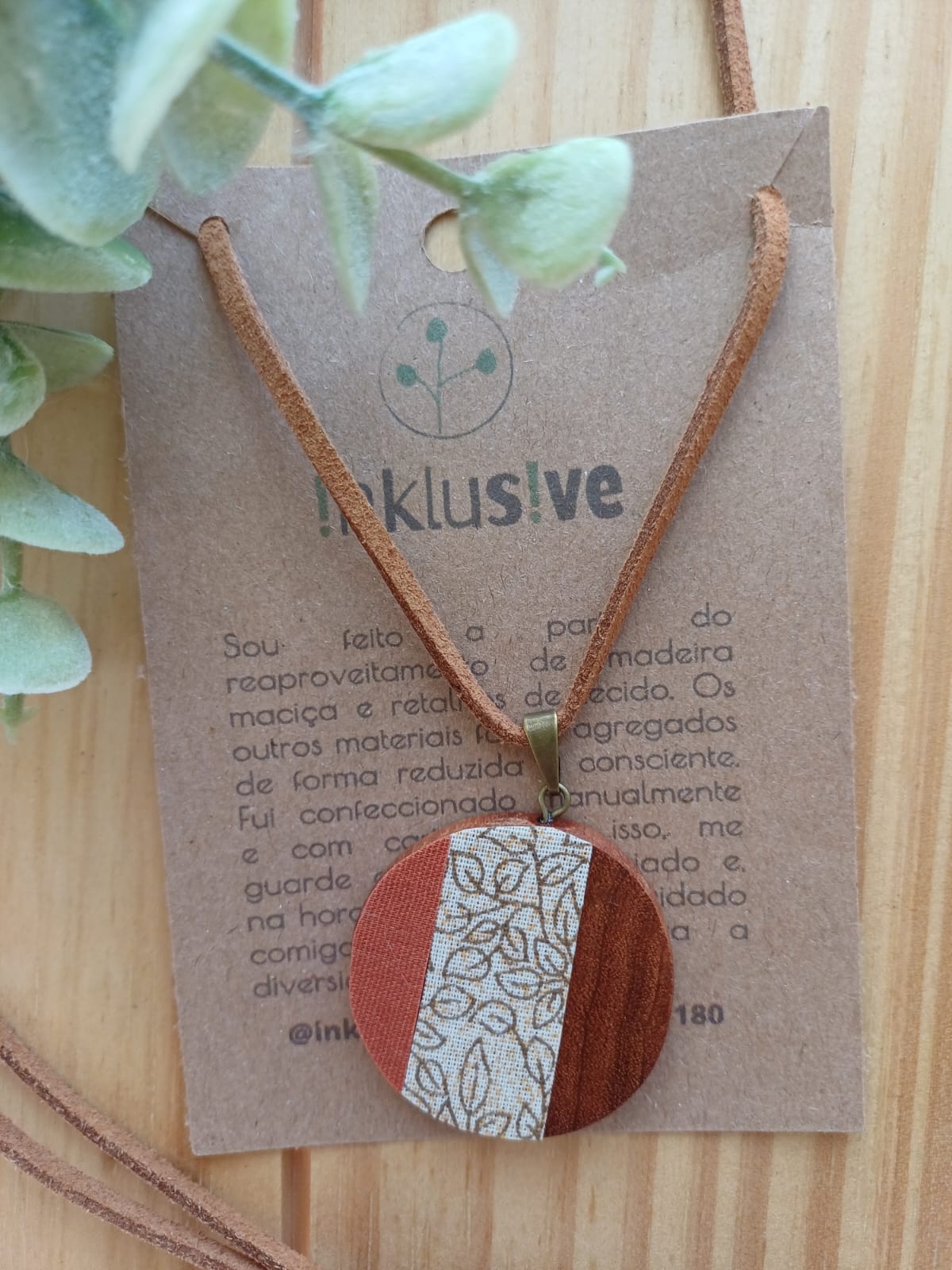 Colar feito de cabreúva (madeira nobre de reaptoveitamento) e tecido. Pingente 3cm. Cordão em camurç Ler mais