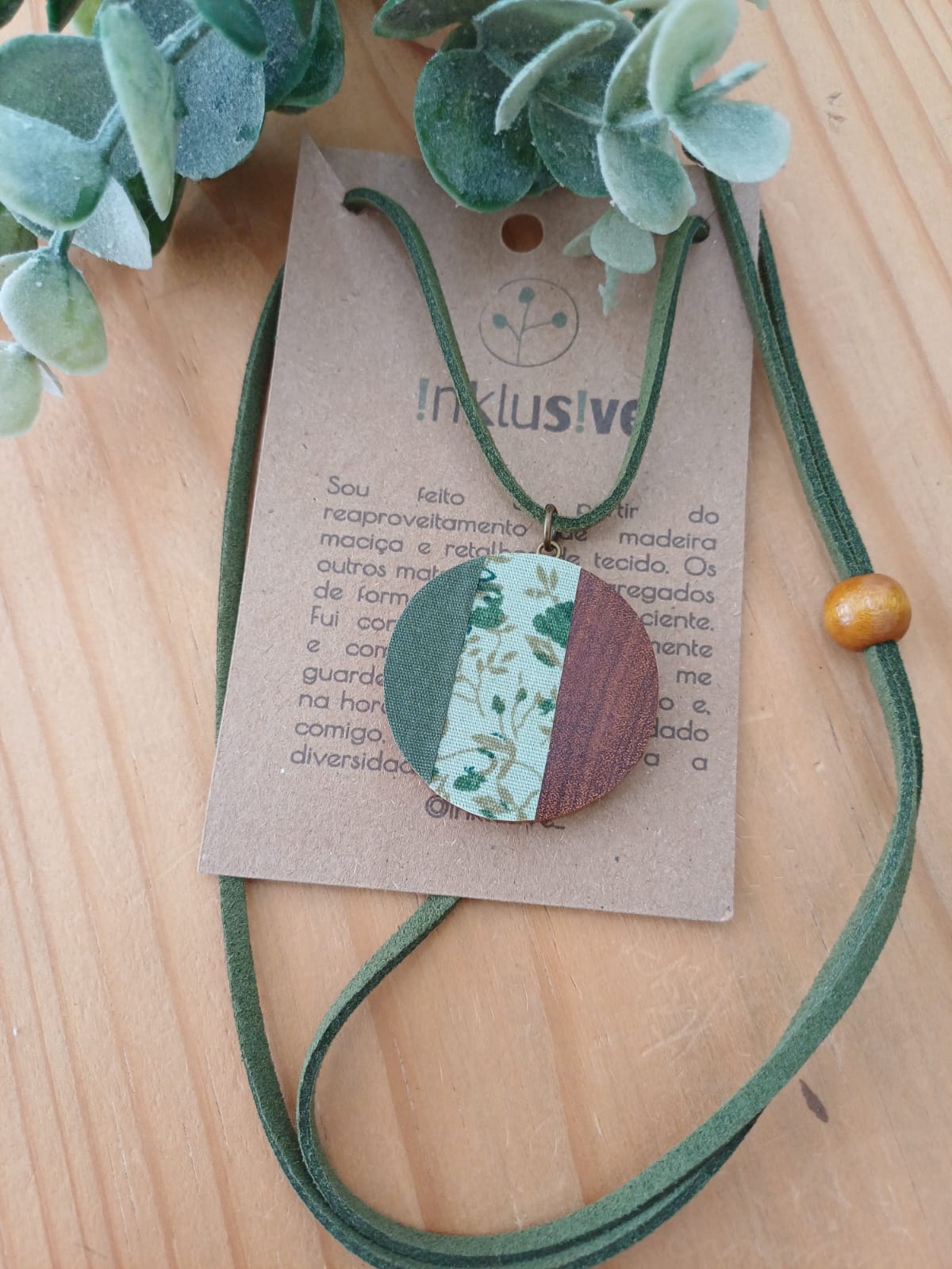 Colar feito de cabreúva (madeira nobre de reaptoveitamento) e tecido. Pingente 3cm. Cordão em camurç Ler mais