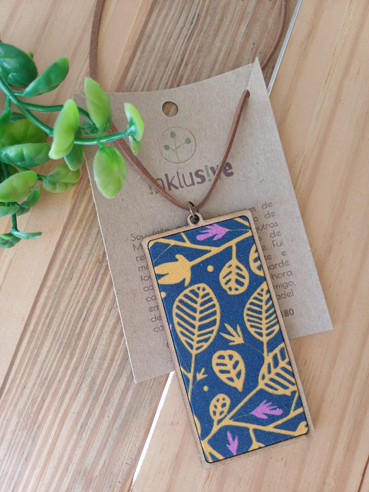 Colar de madeira mdf e tecido de algodão. Cordão em camurça e regulável. Pingente 8 cm.