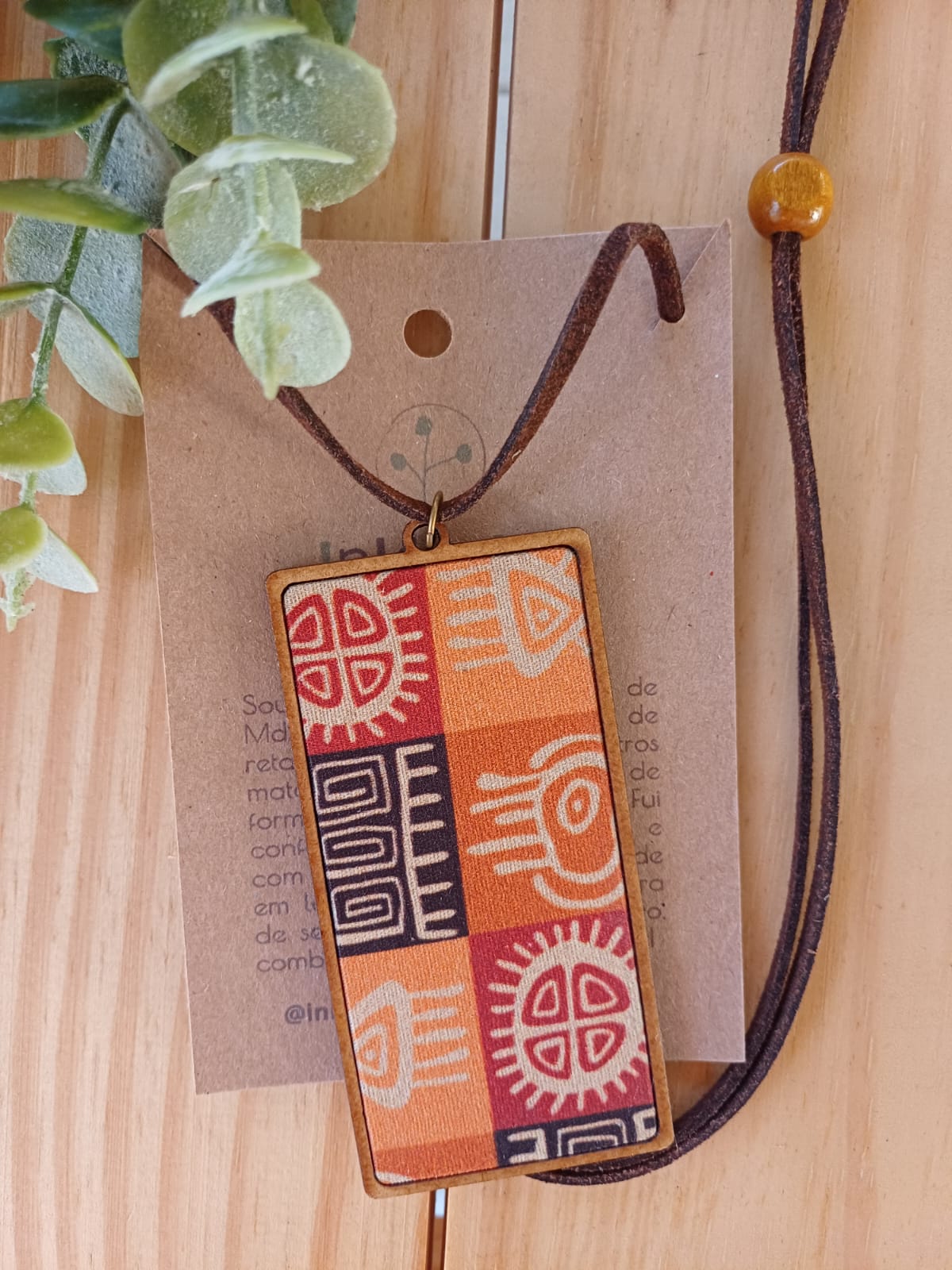 Colar em madeira mdf e tecido de algodão estampado. Pingente 4×8 cm e cordão regulável em camurça.