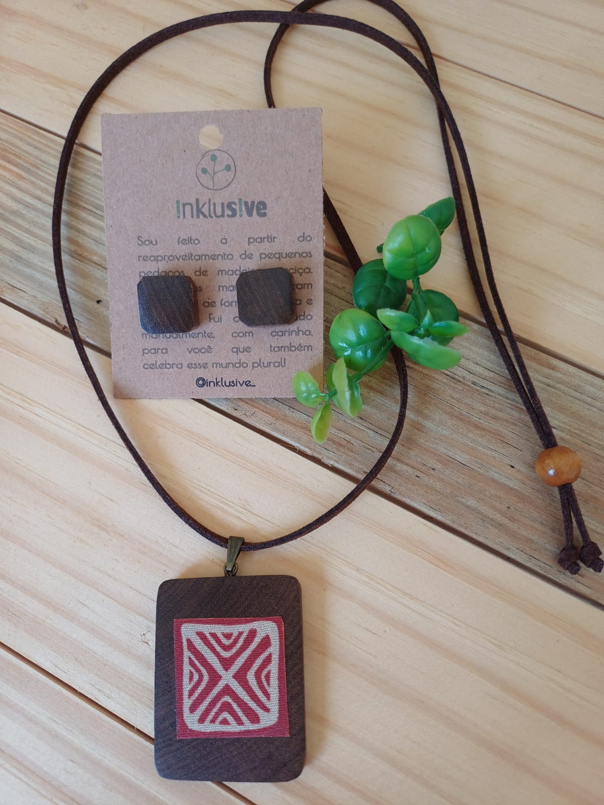 Colar e brinco em madeira imbuia vom cantos arredondados. Colar com detalhe em tecido de algodão est Ler mais
