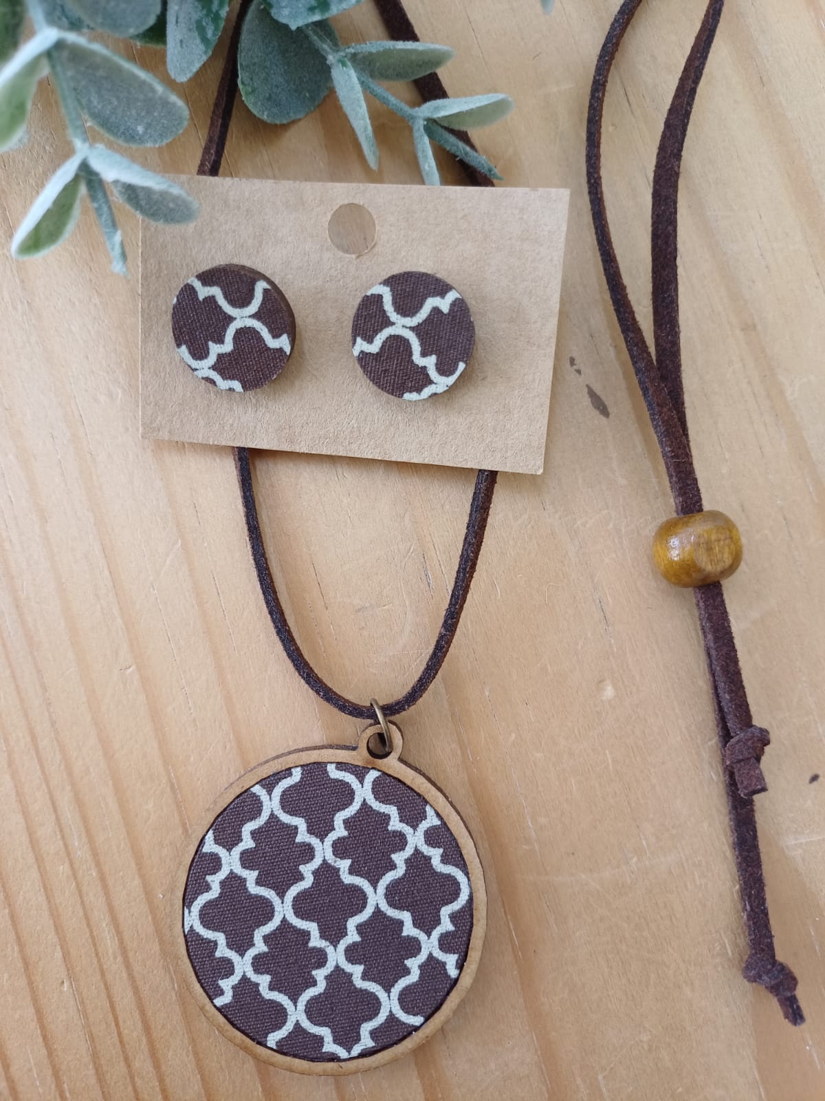 Colar e brinco feitos de Mdf e tecido. Pingente 4cm e brinco 1.5cm. Cordão em camurça regulável.
