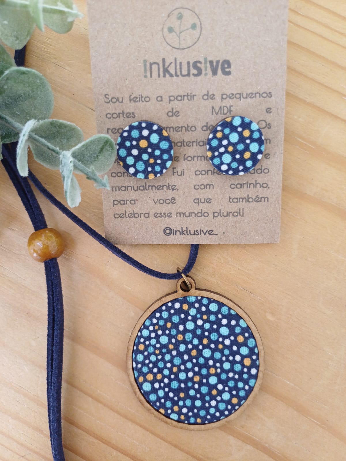Colar e brinco feitos em Mdf e tecido. Pingente 4cm e brinco 1.5cm. Cordão em camurça regulável.