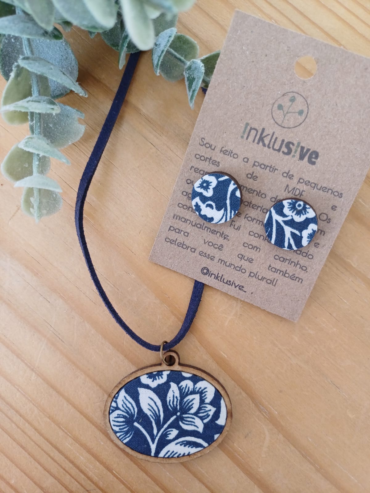 Colar e brinco feitos em Mdf e tecido. Pingente 4cm e brinco 1.5cm. Cordão em camurça regulável.