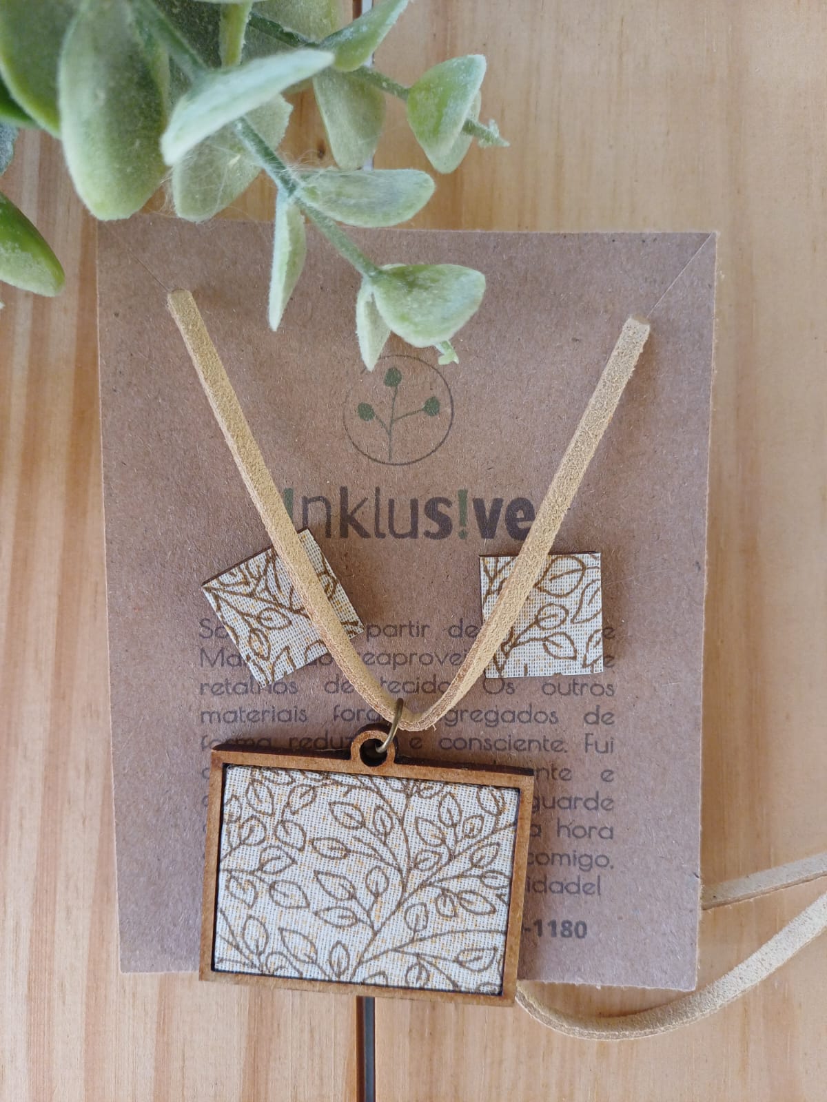 Conjunto em madeira mdf e tecido de algodão estampado. Pingente 4x3cm e brinco 1,5cm. Cordão em camurça regulável.