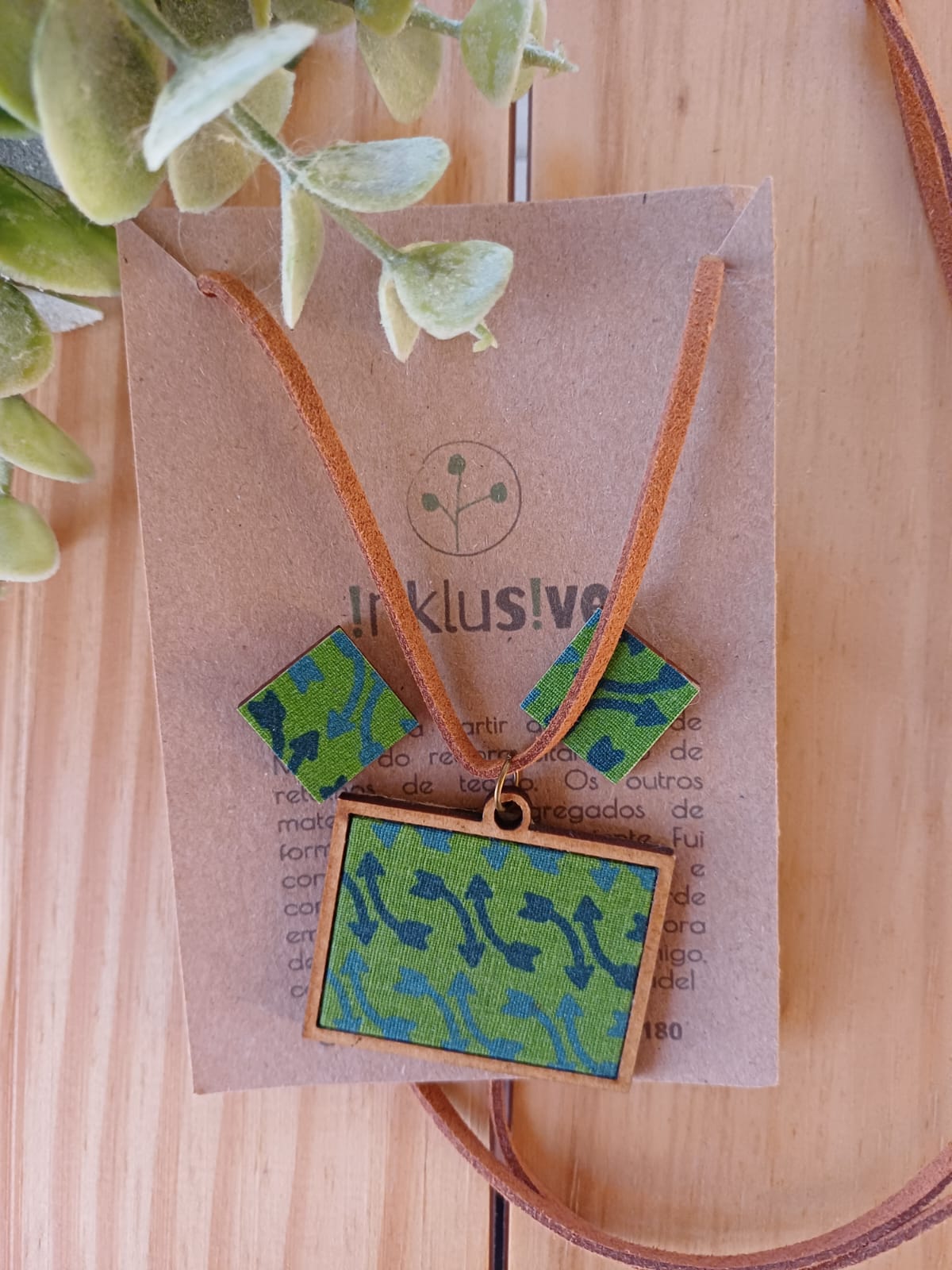 Conjunto em madeira dfm e tecido de algodão estampado. Pingente 4x3cm e brinco 1.5cm. Cordão regulável em camurça.