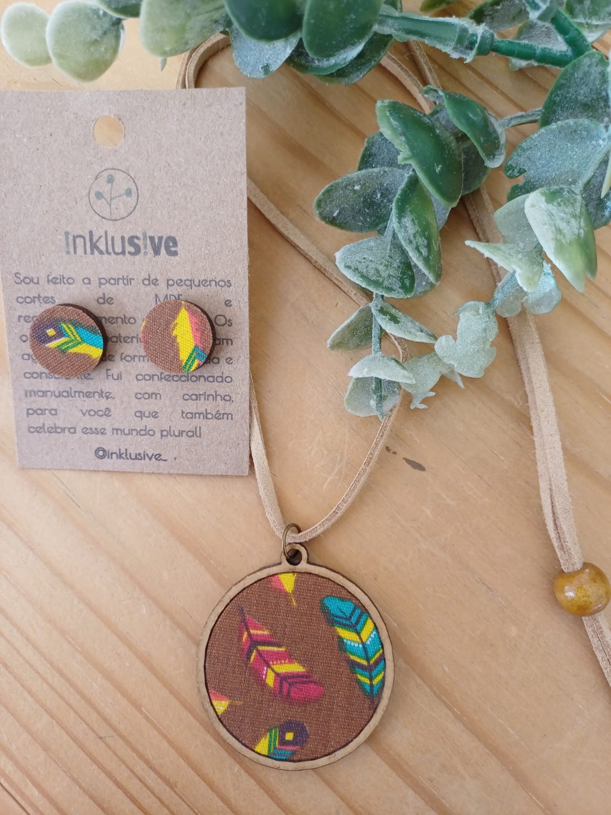 Colar e brinco feitos em Mdf e tecido. Pingente 4cm e brinco 1.5cm. Cordão em camurça regulável.
