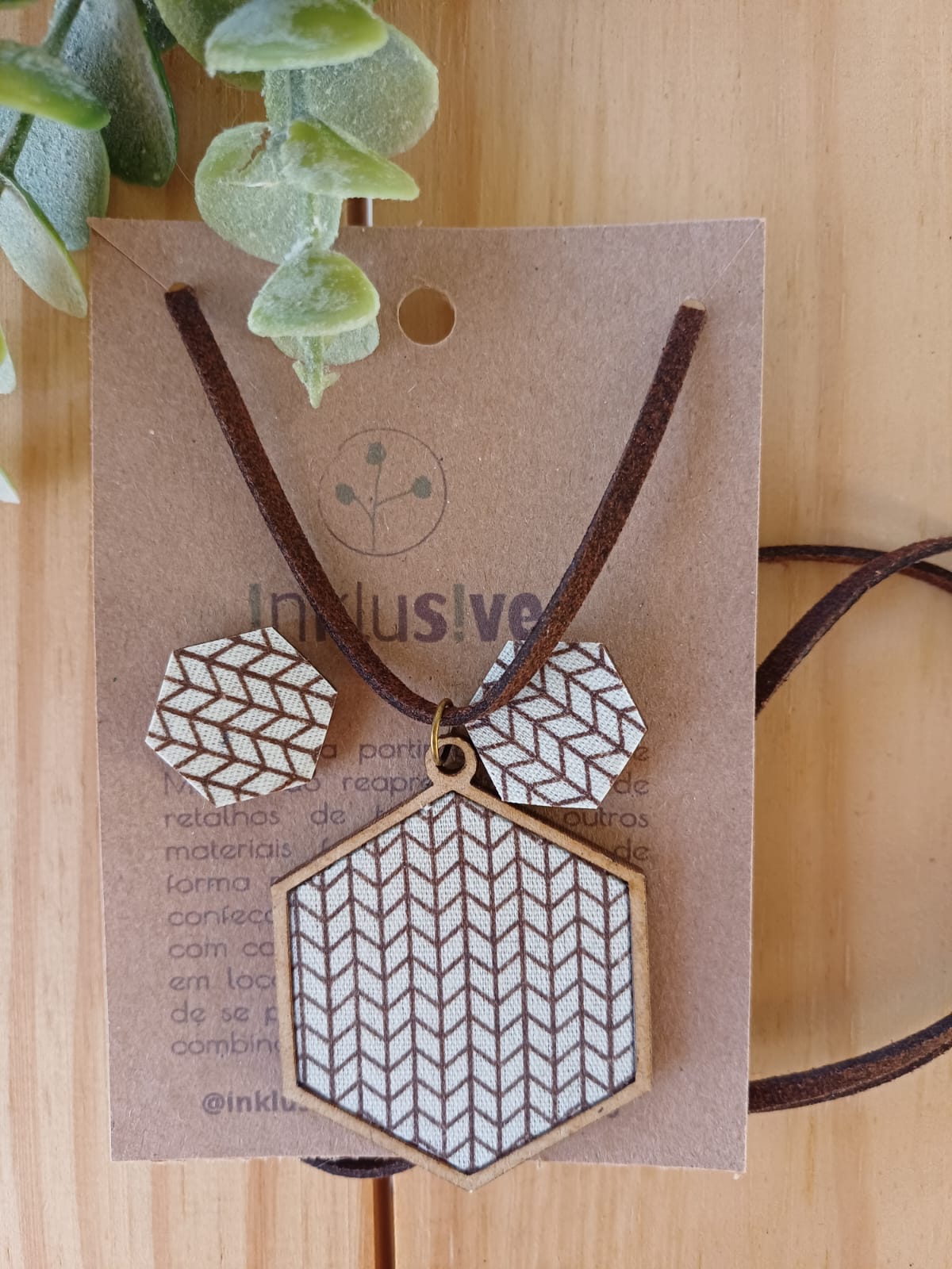 Colar e brinco feitos em MDF e tecido. Pingente 4cm e brinco 1.5cm. Cordão em camurça regulável.