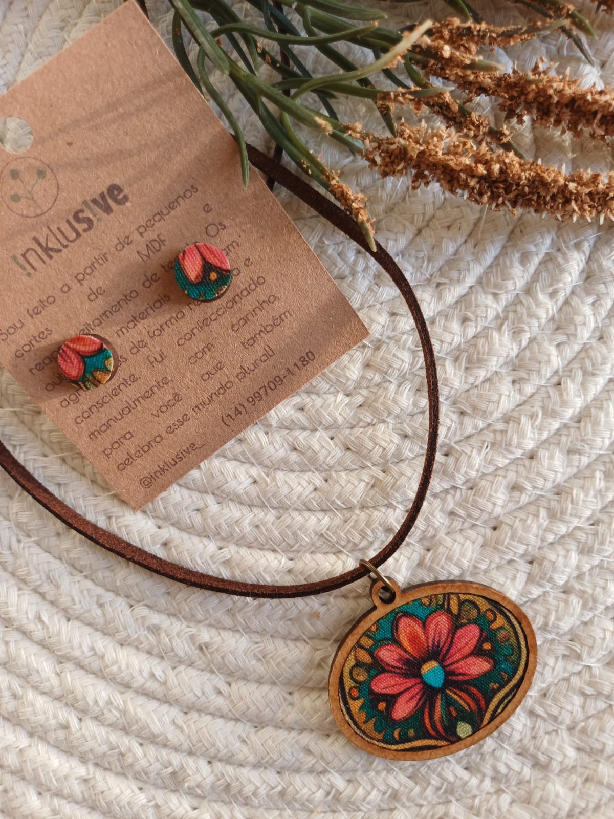 Colar e brinco de madeira mdf e tecido de algodão. Pingente 4×3 cm, brinco 1 cm. Cordão de camurça regulável.
