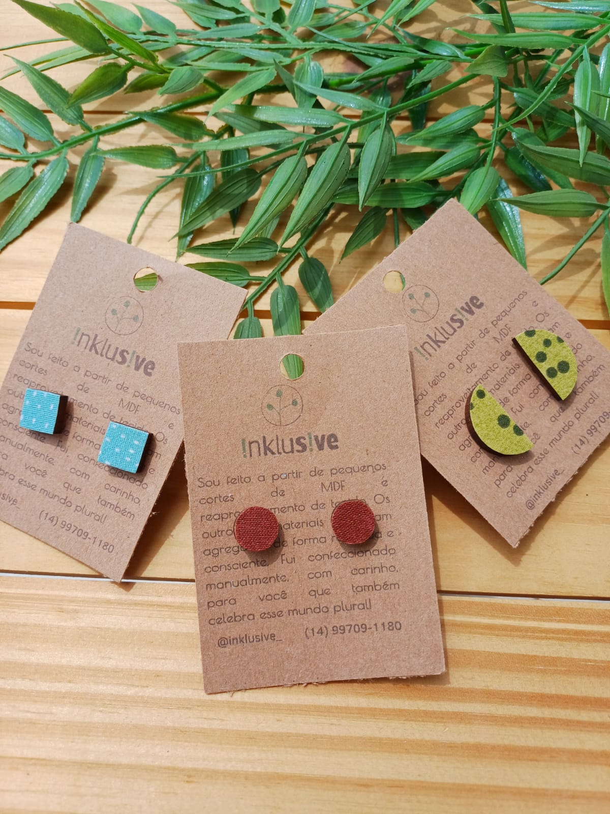 Três mini brincos de madeira mdf e tecido de algodão. Dimensões: 1x1cm, 1cm e 2x1cm.