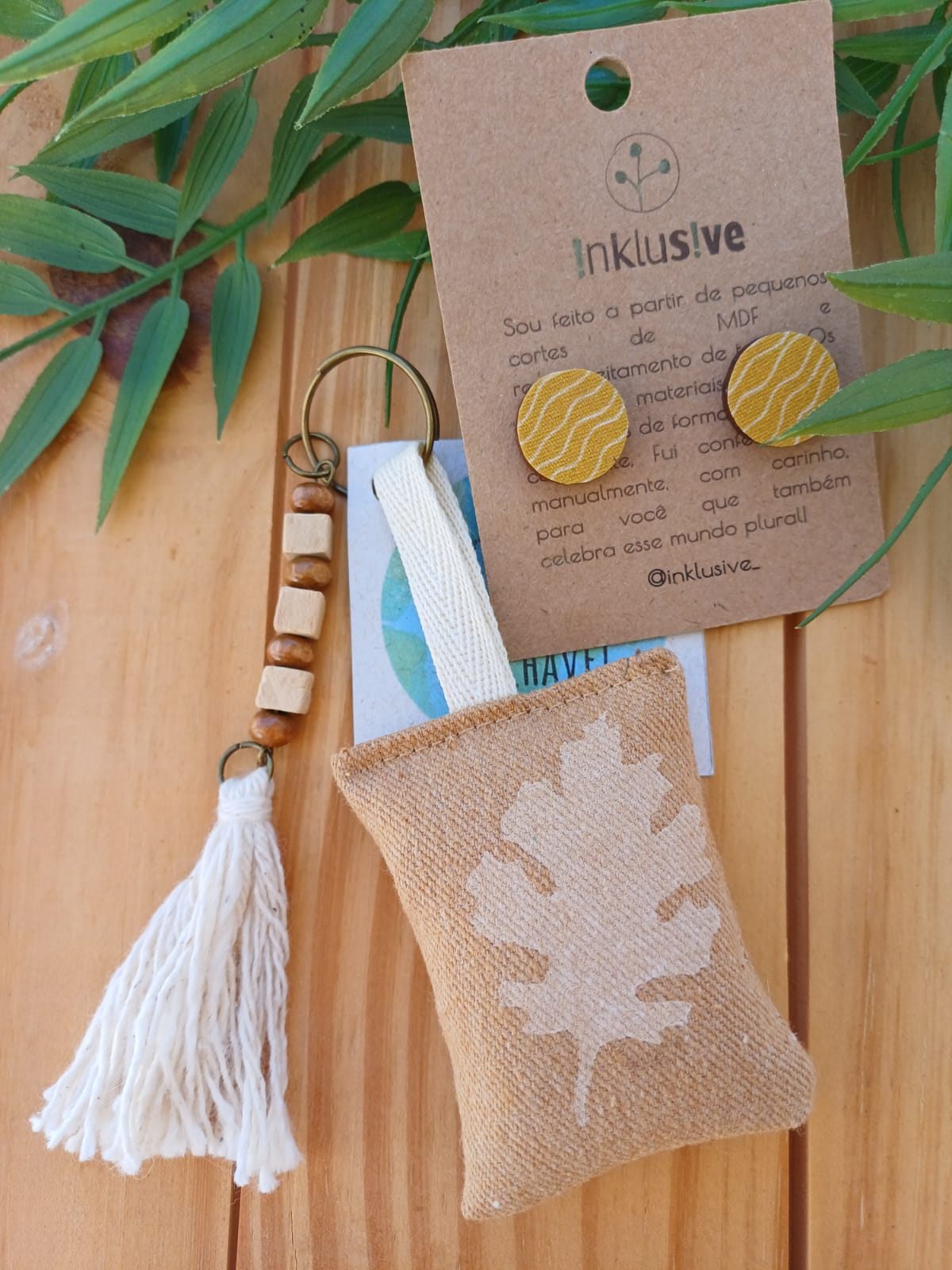 Chaveiro feito de tecido estampado manualmente com penduricalho de madeira e tassel + brinco de madeira mdf e tecido. Tamanho 1.5cm.