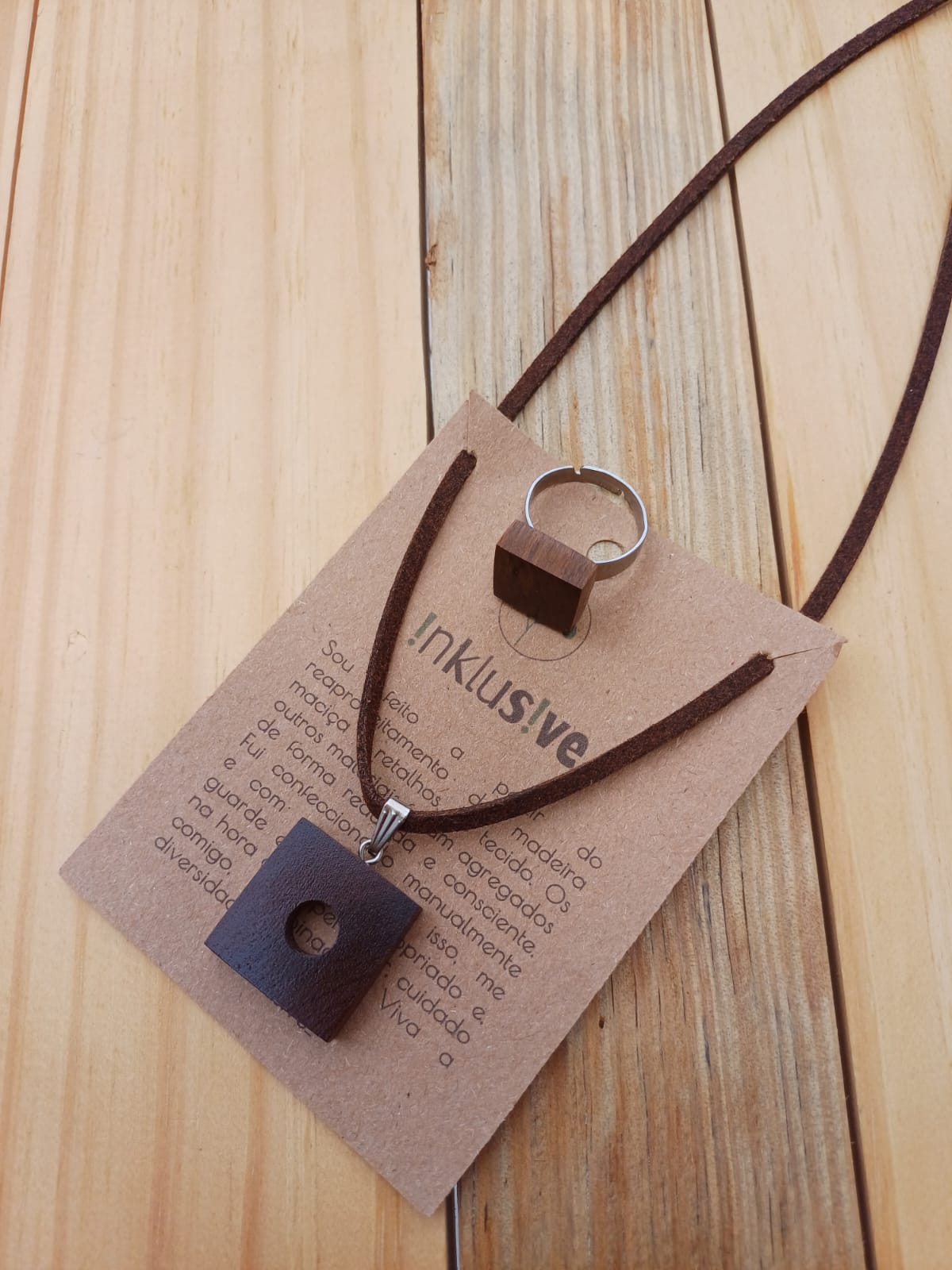 Colar de madeira imbuia e cordão de camurça+ 1 anel madeira maciça regulável