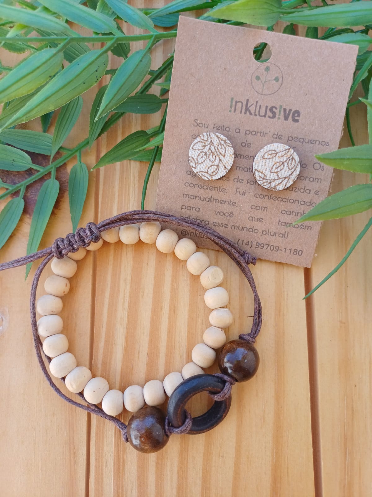 2 pulseiras + brinco. (1 Pulseira de fio de algodão e peças de madeira, 1 pulseira de contas de madeira cru e 1 brinco de madeira mdf e tecido estampado).