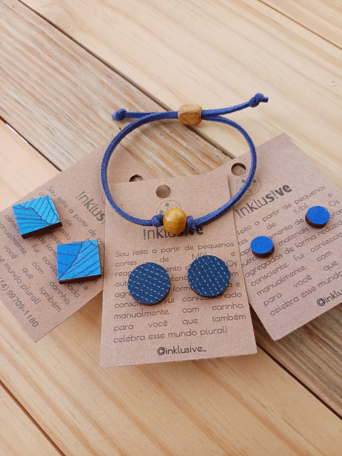 3 brincos de madeira mdf e tecido de algodão + 1 pulseira de camurça com conta de madeira.